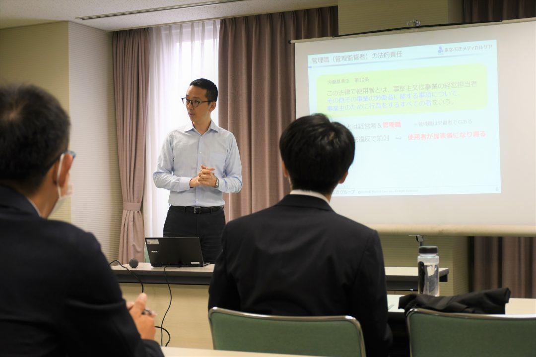 あなぶきメディカルケアにおける管理監督者としての「施設長」という役割や責任、権限などを理解し、今後現場で実践できるよう、しっかりとこの研修でインプットしていきましょうとお話がありました。