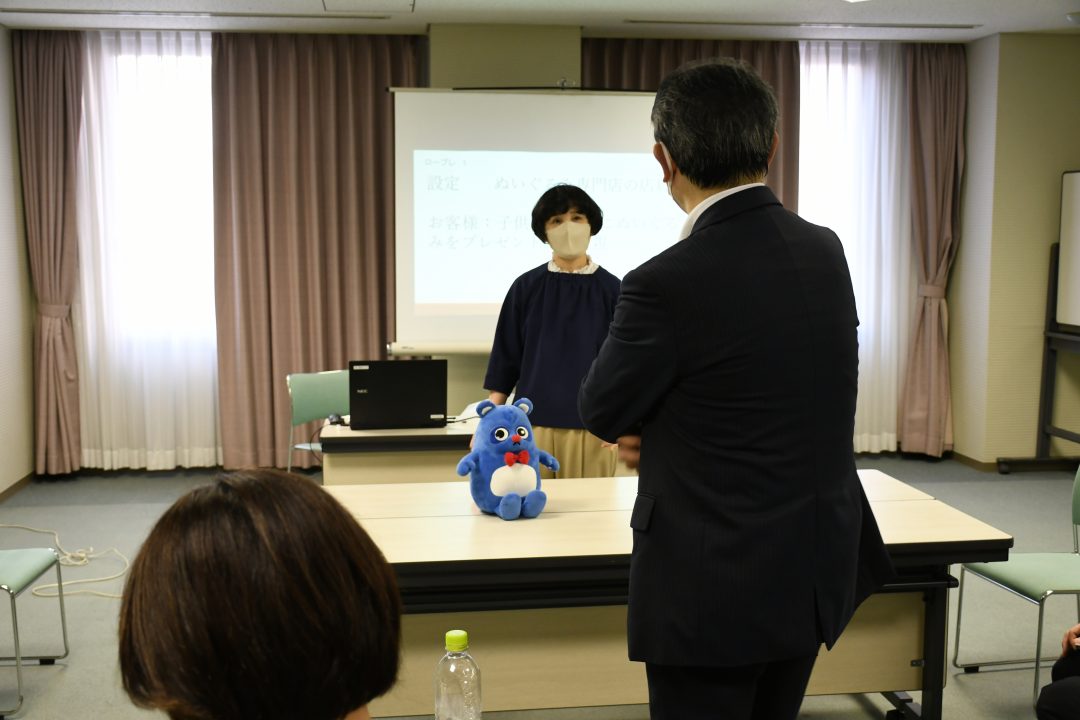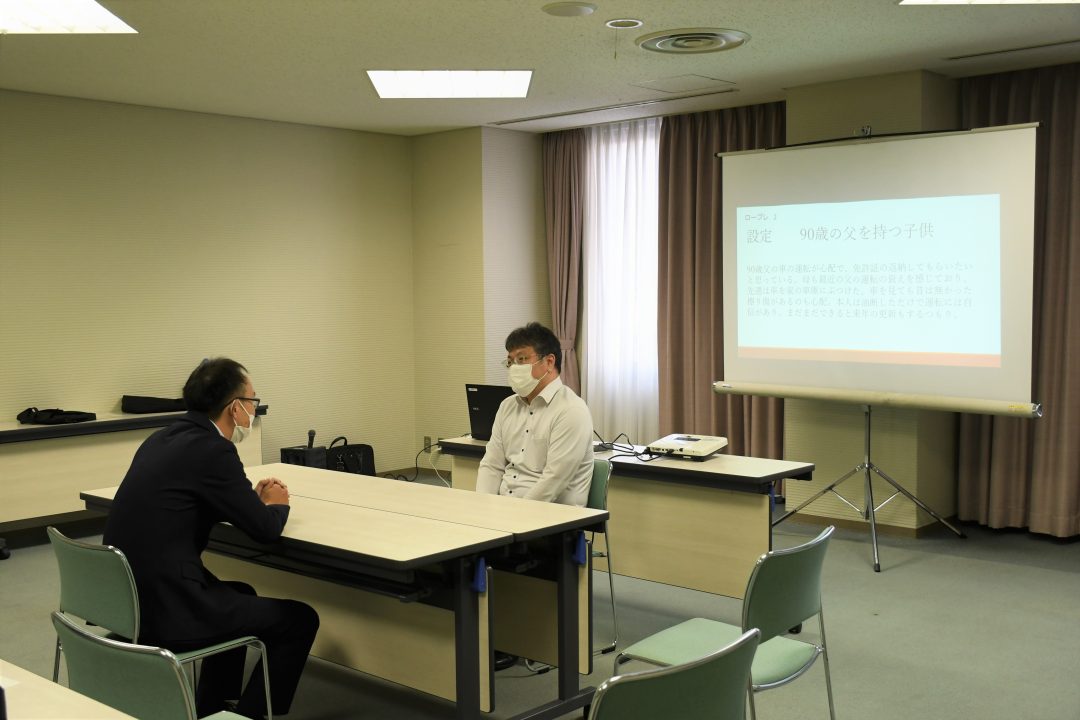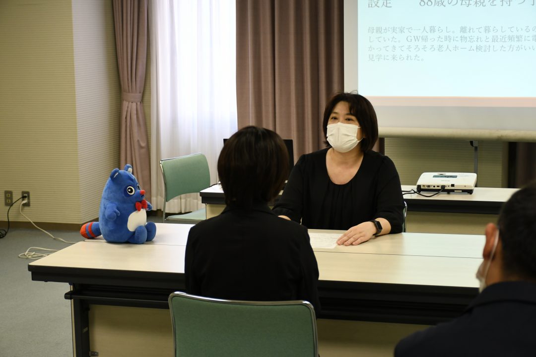 1日目の最後は、あなぶきヘルスケア 高齢者住宅紹介事業部のふくなが部長より、入居を検討されているお客さまへの質問の仕方や提案のコツなどをお話いただきました。お客さまとスタッフに分かれシチュエーション別にロールプレイングをし、良かった点、改善点を話し合いながらスキルを磨きました。
