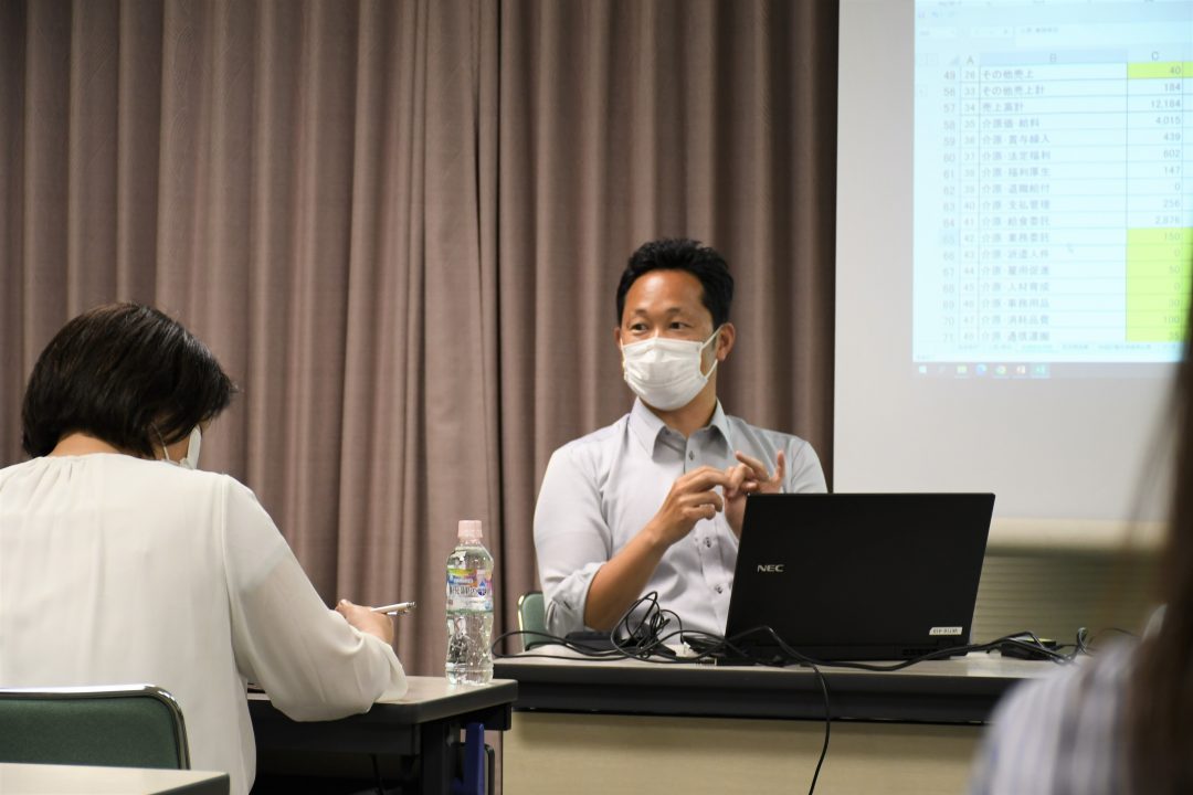 まずは、おぶ本部長より事業スキーム、収支の見方、内部統制、コンプライアンスのお話がありました。難しい内容ですが、参加者と対話しながら話を進めてくださり、理解が深まりました。すでに施設長として就任している3名は、働きながら感じていた疑問をクリアにできたようです。休憩中にも疑問点を話し合うなど、積極的に学ぶ姿勢が感じられました。