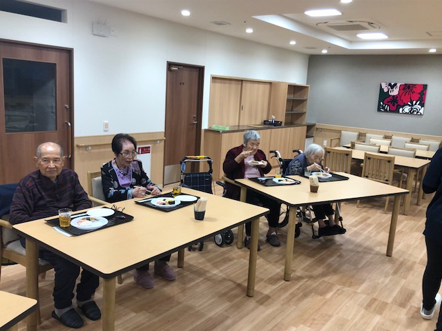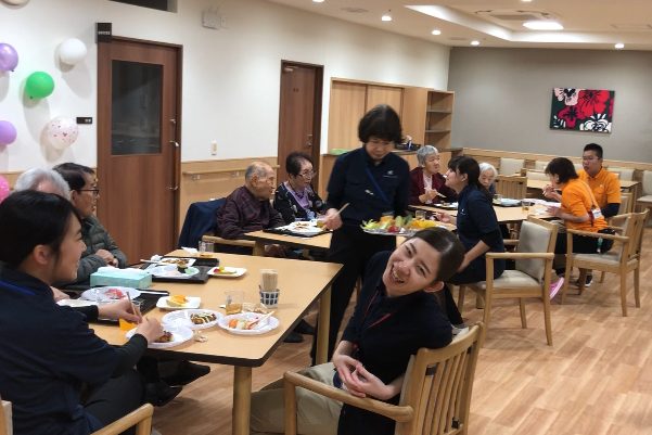ご入居者も一緒に【happy birthday】を合唱♪「おめでとう、ありむらさん!」益々、レストランも賑やかになりました。