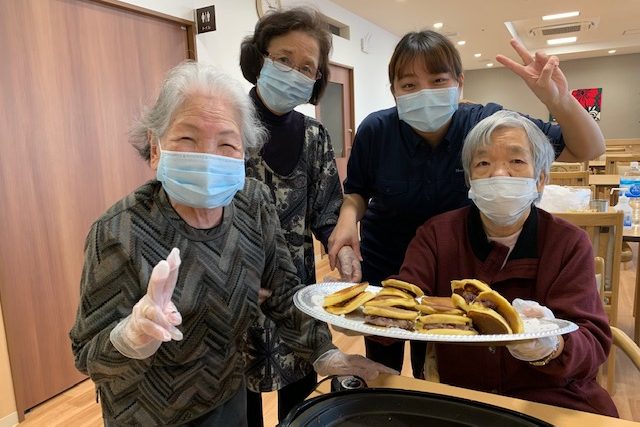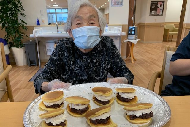 今回は、ご入居者のご希望でどら焼きを作りました。皆さま、さすが主婦の先輩!手際が良く、私たちスタッフに教えてくださりながら作りました。