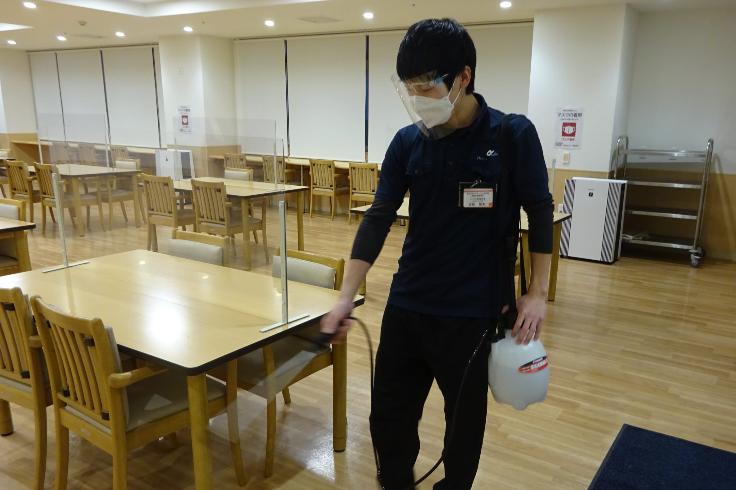 これは噴射機を使い、次亜塩素酸で消毒を行っている様子です。