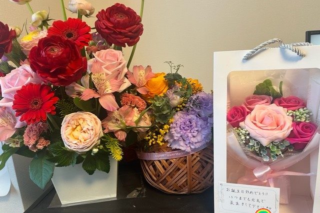 大好きな息子さま達からのお花やケーキに終始笑顔で、「いくつになっても嬉しいね~。お花が好きだからね、よく分かっている。」と嬉しそうな表情をされていました。