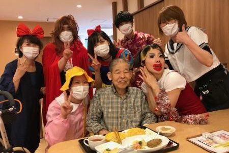 昼食の時間帯で仮装をしたスタッフが集まり、ご入居者へお披露目。