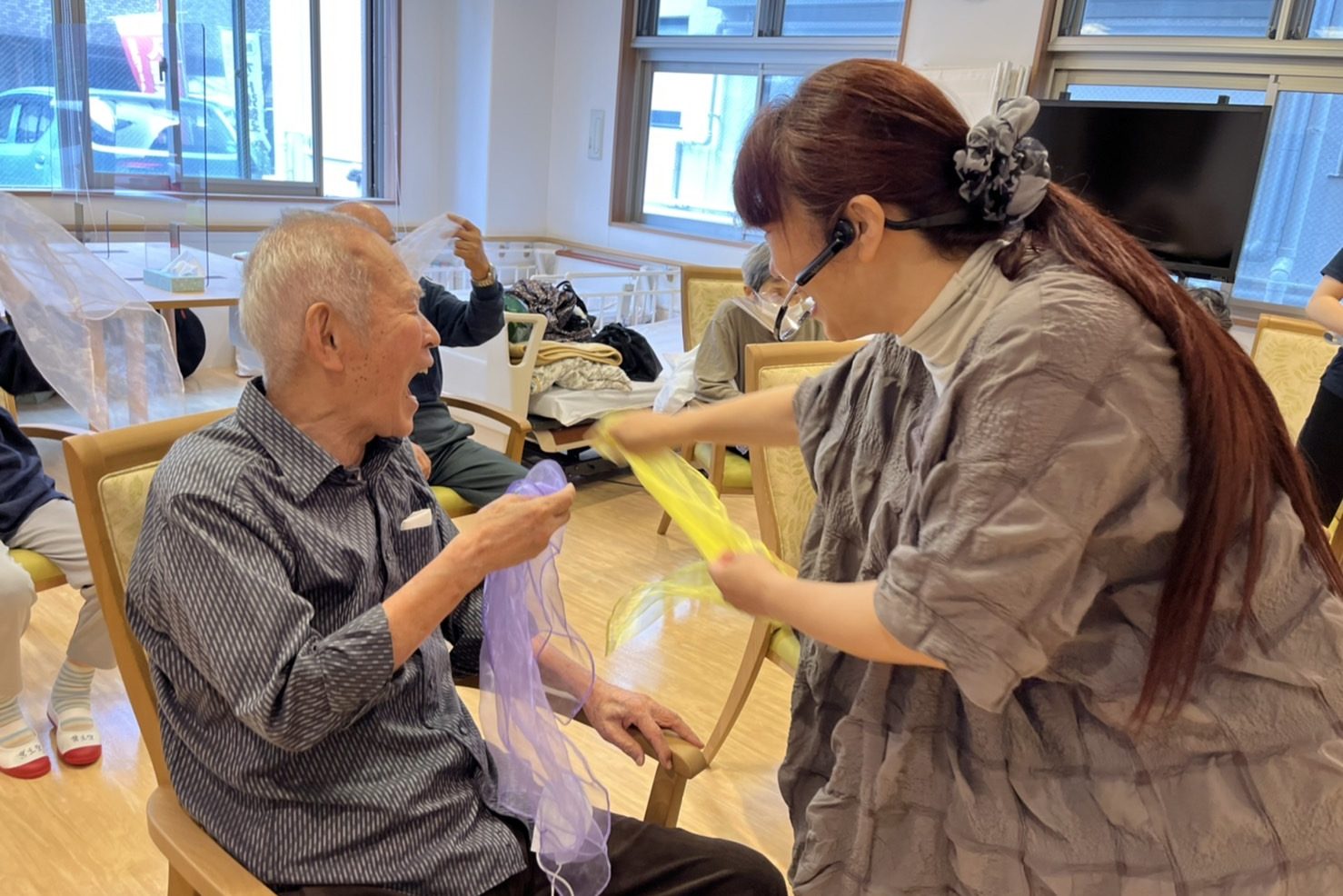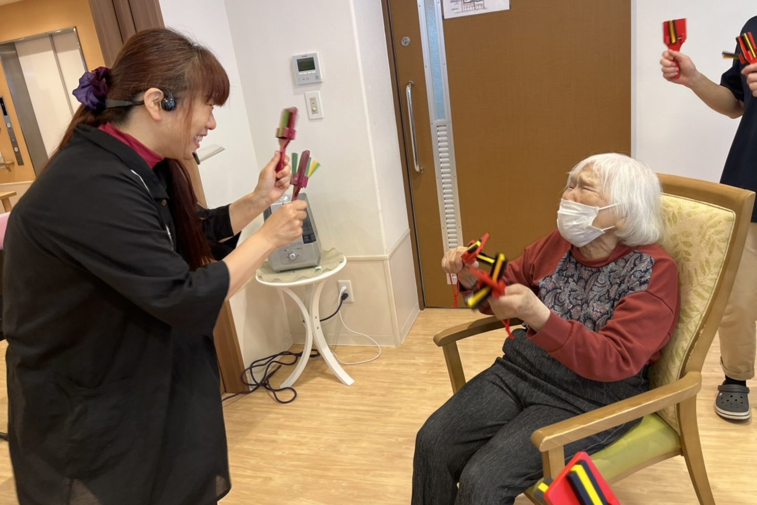 いつも明るいHさまも、音楽療法が終わってしまった後、「寂しか~。あんたと踊ろうかね」とスタッフのおおさこさんと一緒に踊られていました♪
