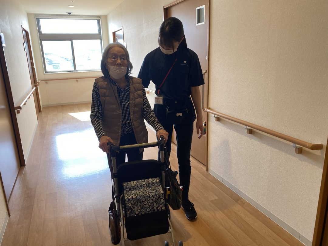 ご入居者さんと会話している時に、介護を選んでよかったなと思います。どんな些細なことでも「ありがとう」と言ってくださったり、すれ違う時には、挨拶してくれたり、名前で呼んでもらえたりと、毎日とてもうれしいです。誰かの役に立っているというのが実感できます。