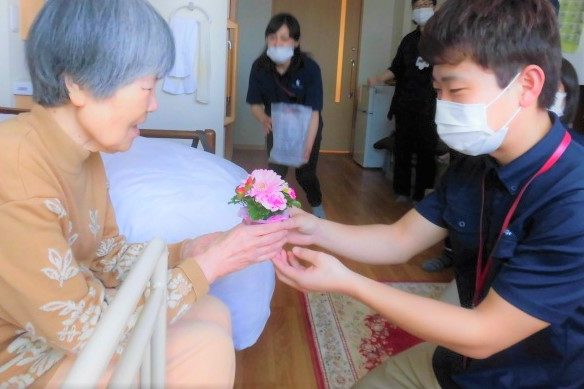 ご入居者のお部屋に訪問する際、スタッフから「お祝いするのは、この4月に入社し、少し緊張もほぐれてきた新卒のくすおかさんからしてみては?」と声が上がり、くすおかさんに声を掛けました。
