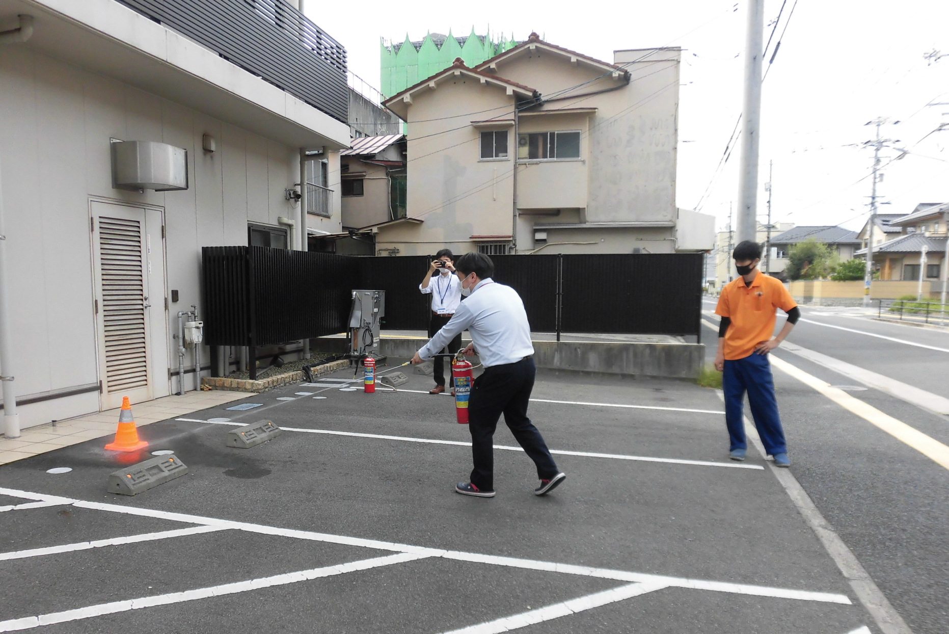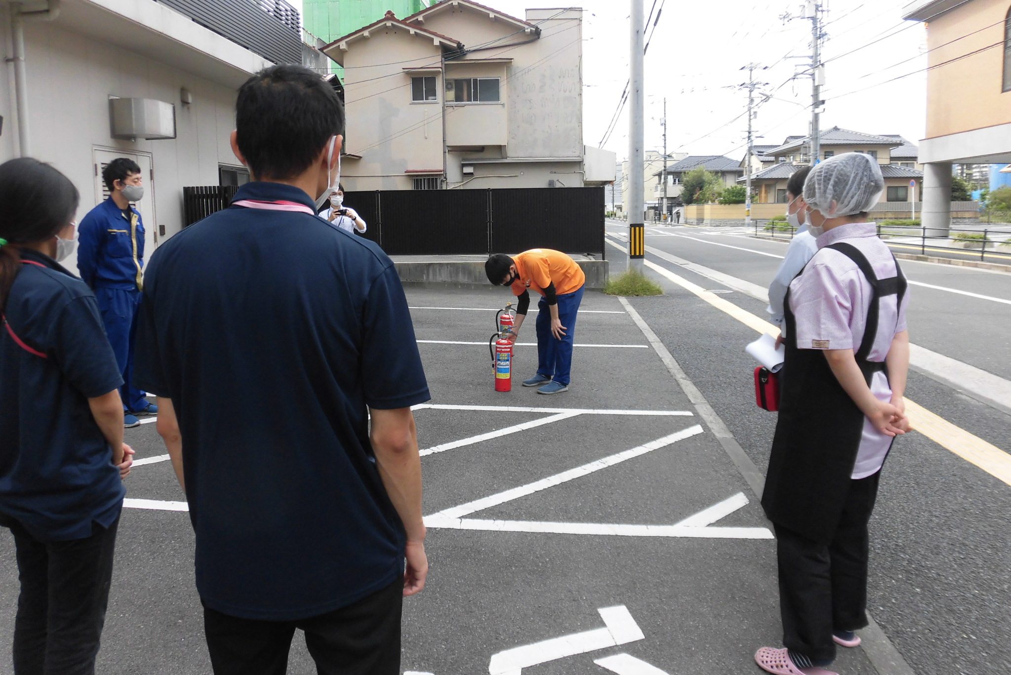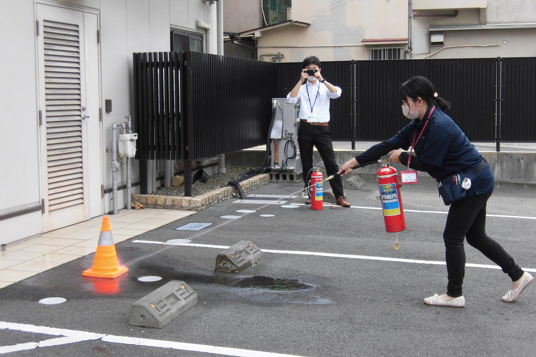 訓練の最後に、水消火器を使っての消火訓練を行いました。