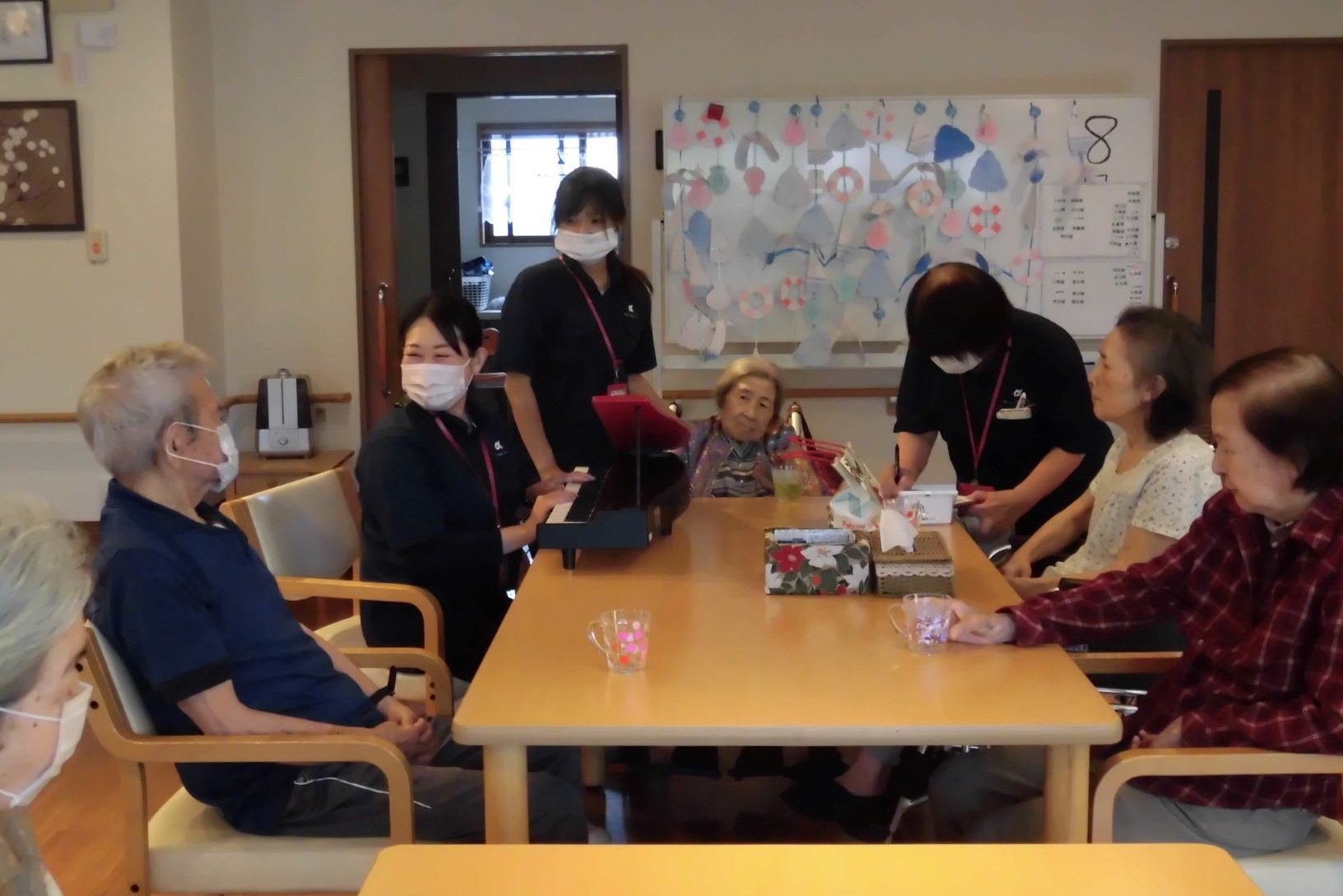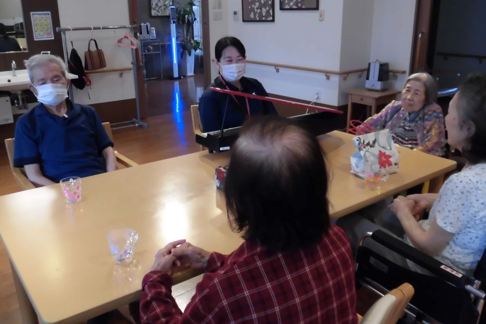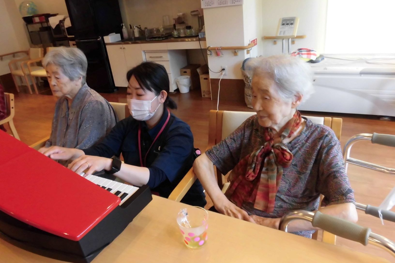 音楽療法士の資格を持つ介護スタッフかきたにさんが、まずはゆっくりとした穏やかな季節の曲をミニピアノで演奏し、ご利用者に聞いていただきます。