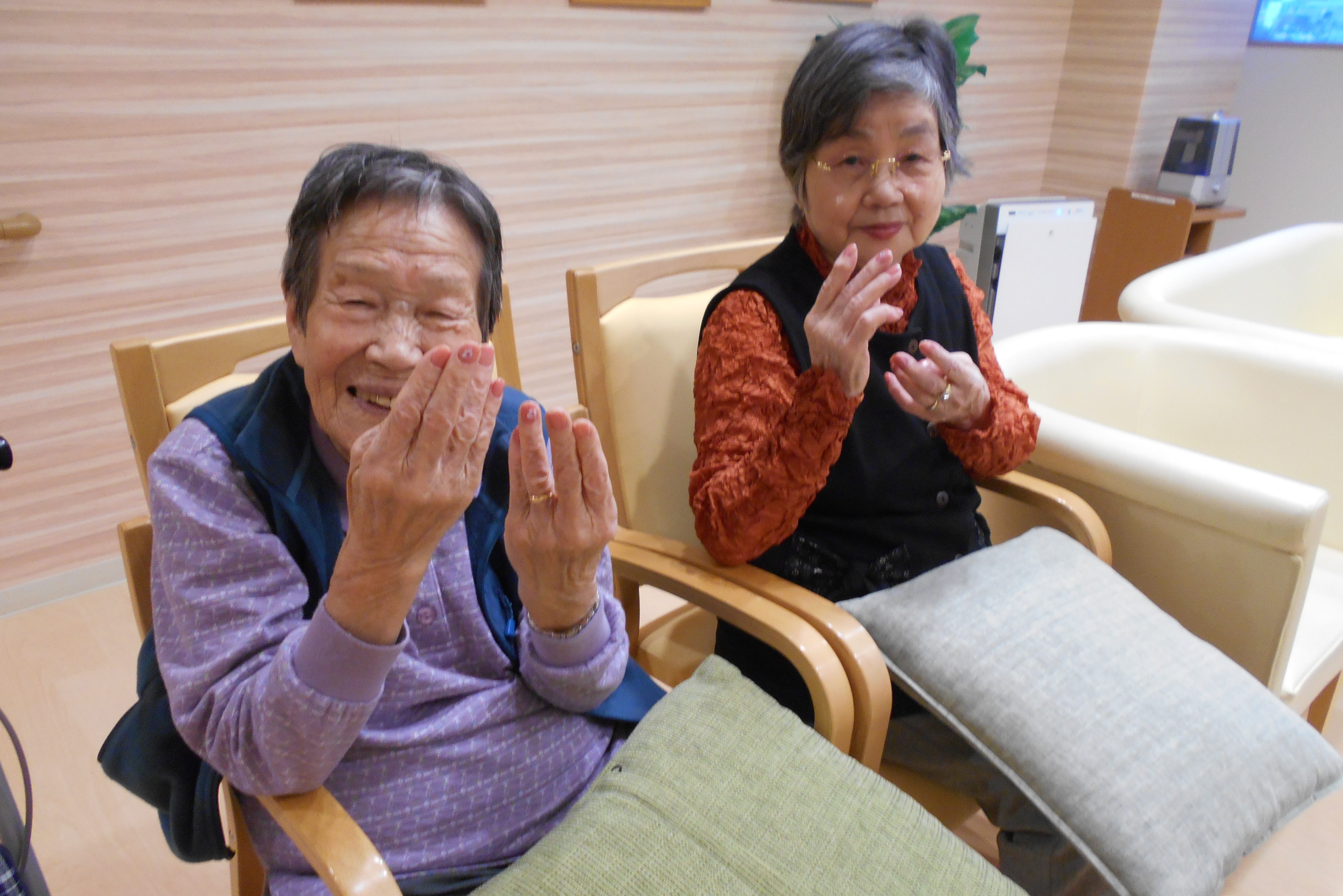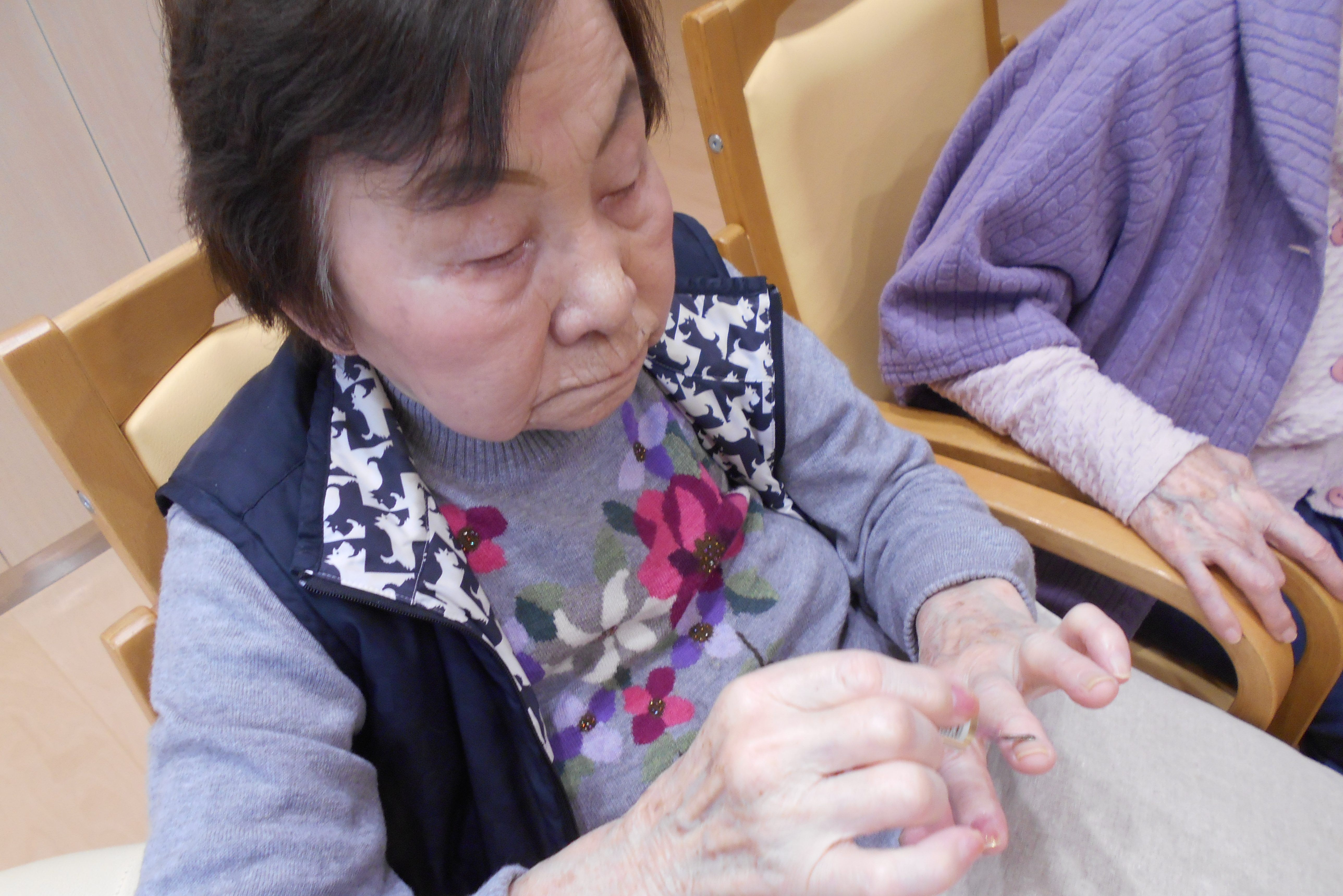 「夜が長いねぇ」「何しようかぁ?」の声に、「今日はおしゃれしてみませんか?」と、スタッフがマニュキュアを手にお声かけしました。