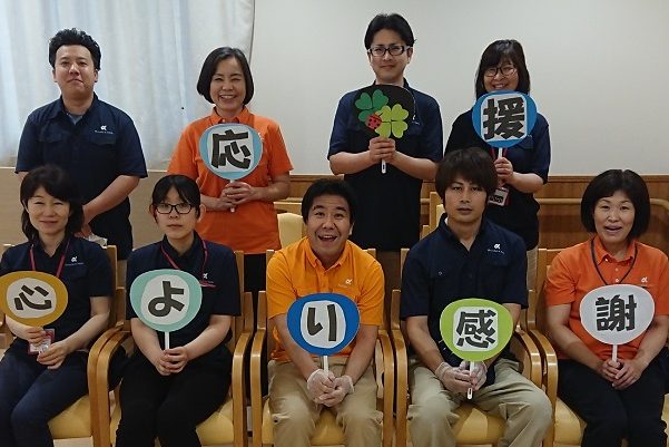当ホーム、アルファリビング松山よつば循環器科クリニック前において、新型コロナウイルス感染症が拡大する中、各アルファリビングからの物資や一緒に働く仲間からの励ましの言葉に、私たちは勇気づけられました。