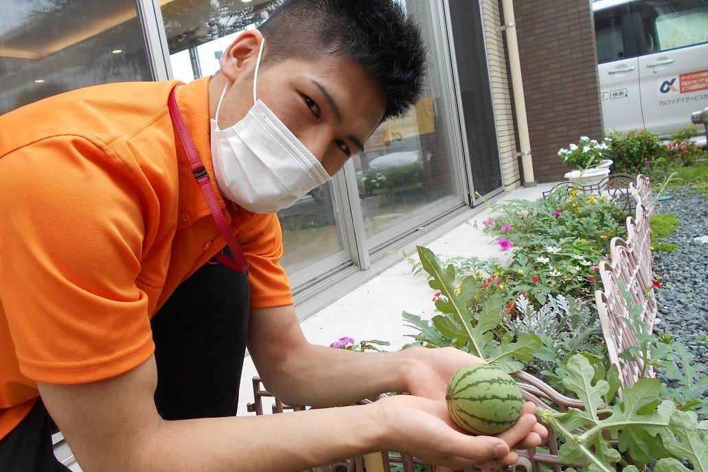 そんなご入居者に、少しでも季節の変化、夏らしさを感じていただきたと考え、看護スタッフのいのしたさんが、スイカの苗を植えました。