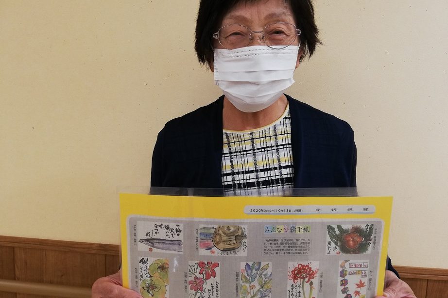 投稿される絵手紙は、季節の食べ物、花の作品が多い中、大切にしている色鉛筆と以前にご自身で折った四角形のつるし飾りを描き、想いを言葉に載せ、この度掲載されました!!!